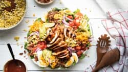 Serving this salad as a family-style meal makes it easy to put together quickly and be ready to enjoy in no time. The combination of flavors will make everyone’s taste buds happy! So go ahead and dig into this delicious family style Chicken Cobb Salad with the ones you love.