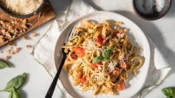 4. Combine Pesto with Noodles to coat. Garnish with extra Parmesan, Walnuts, and a dollop of Pesto.